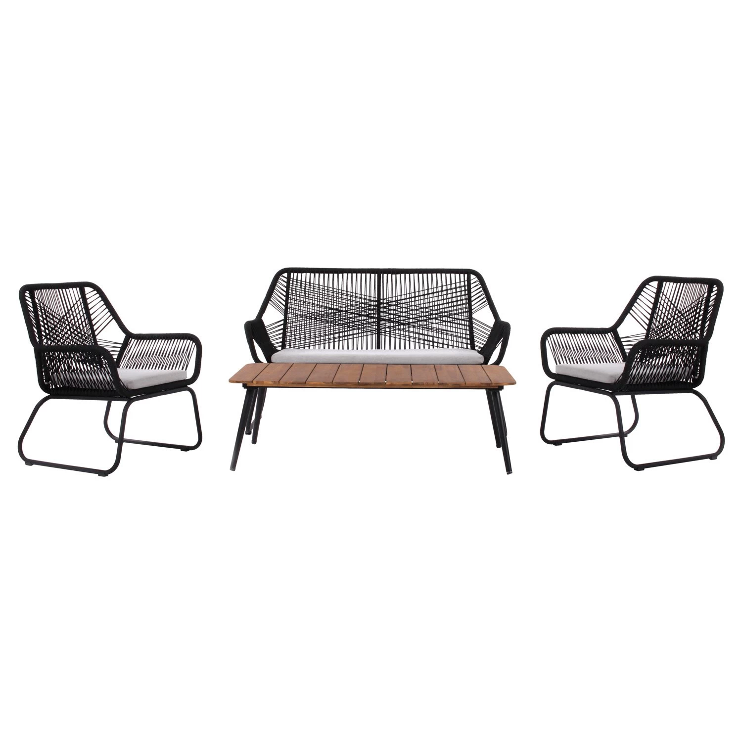 De “NAPOLI loungeset zwart” is een moderne en eigentijdse loungeset van het merk Royal Seasons. De set wordt geleverd met 2 NAPOLI loungestoelen, een NAPOLI bank en een NAPOLI salontafel, allemaal in de kleur zwart. De stoelen en bank hebben een stalen frame met zwart gekleurd touw (5 mm dik) en de tafel heeft een stalen frame met een acacia houten tafelblad. Deze loungeset is een perfecte aanvulling op elke tuin of terras en biedt comfort en stijlvolle ontspanning voor minimaal 4 personen.
