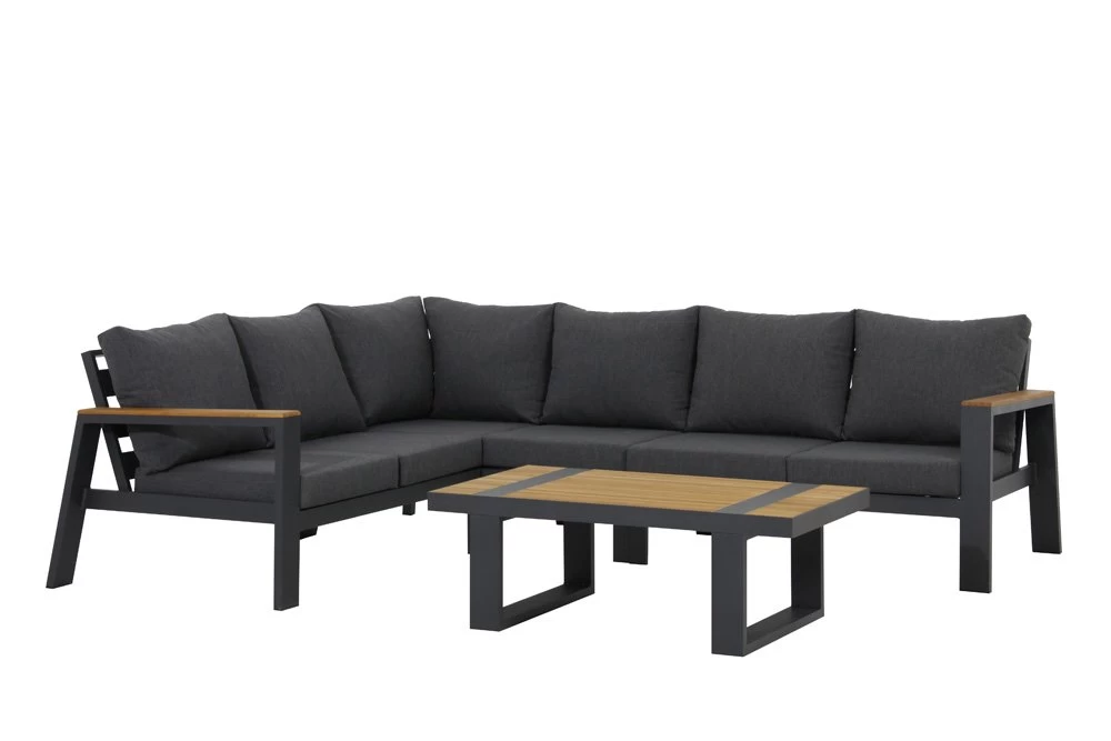 Op zoek naar een mooie hoeklounge? Wellicht is de SUMATRA loungeset van Royal Seasons iets voor jouw. De hoekbank heeft de volgende afmetingen: 295 cm x 235 cm en is inclusief de salontafel. De kleur van deze tuinset is donkergrijs, maar met houtkleurige elementen. Het tafelblad en de armleuningen zijn gemaakt van teakhout wat bijdraagt aan de luxe uitstraling van deze tuinset. De loungeset is inclusief de bijbehorende kussens.